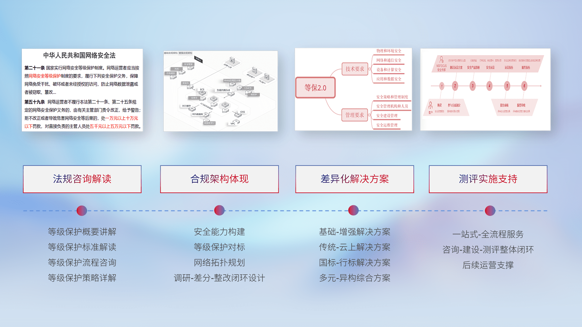 通过专业的法律咨询解读、、合规架构体现、、、差异化解决方案、、、、测试实施支持等服务,,为客户量身打造等保合规体系。。